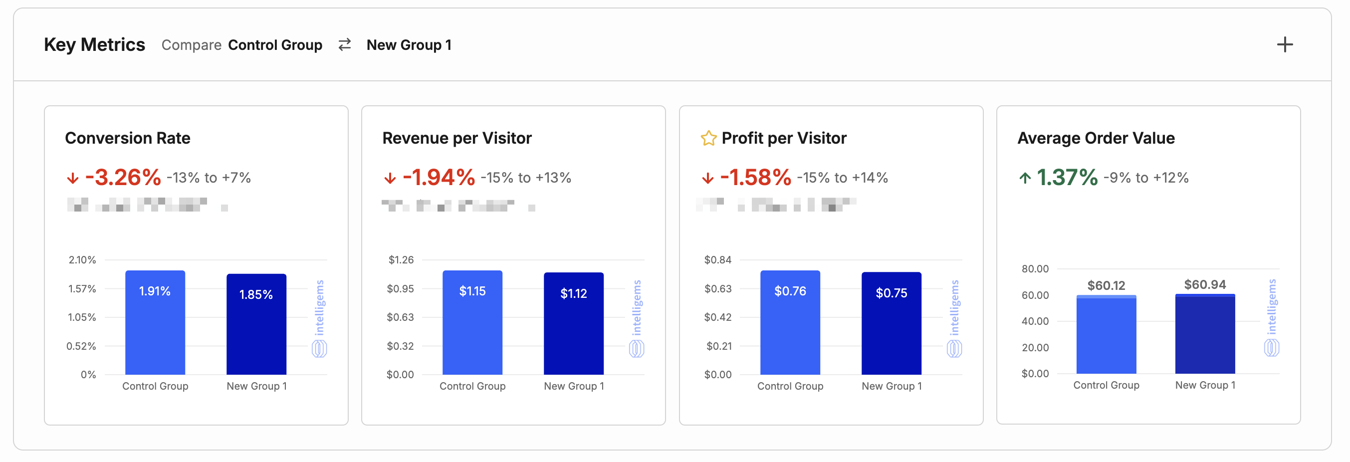 Results will look something like this – an example from Intelligems. Your CRO tool does not measure the email/SMS impact, therefore, you need to track your list growth impact separately here.