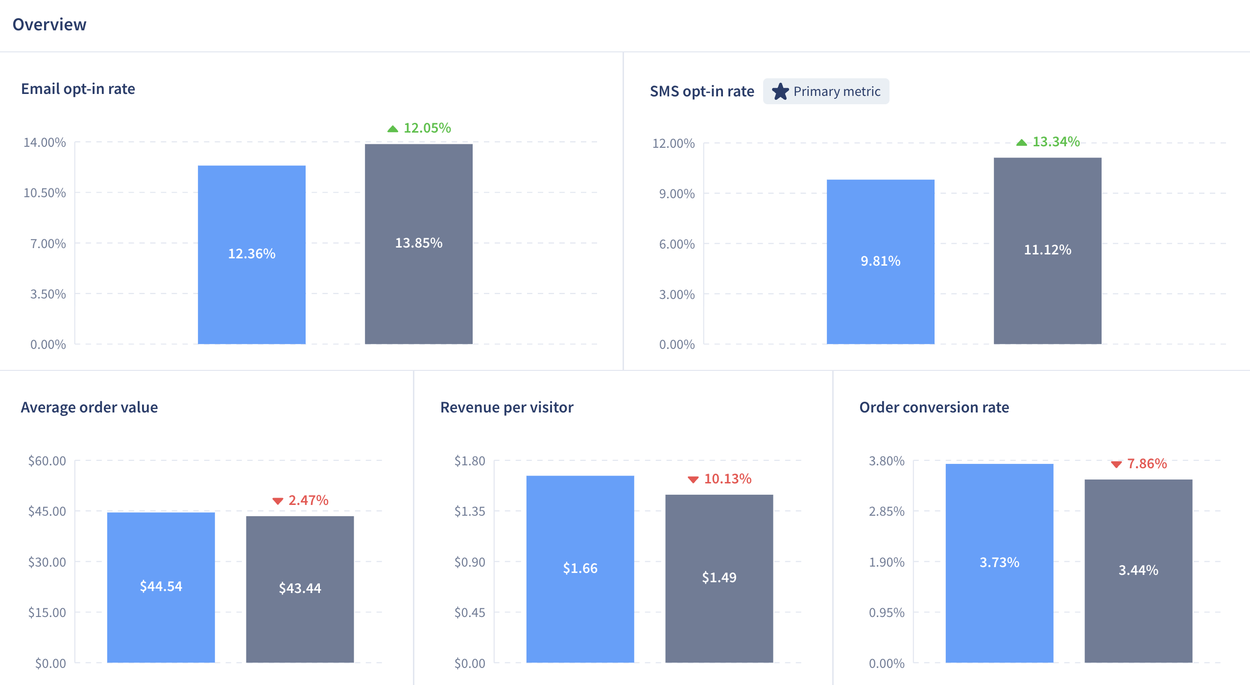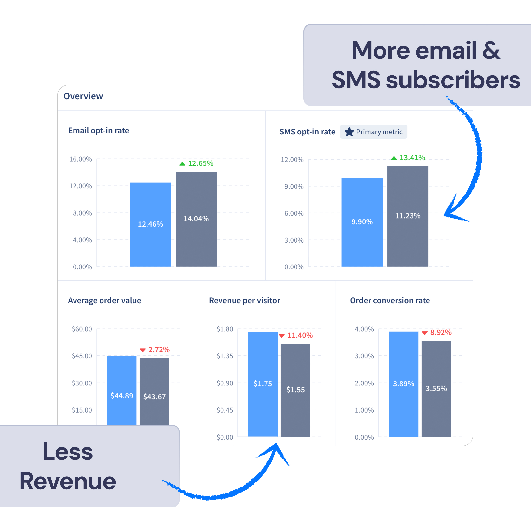 You’ve probably run a popup A/B test before. Your email or SMS platform allows you to test the performance differences between two popups. However, those performance indicators are always reduced to two basics: email and SMS opt-in rates.