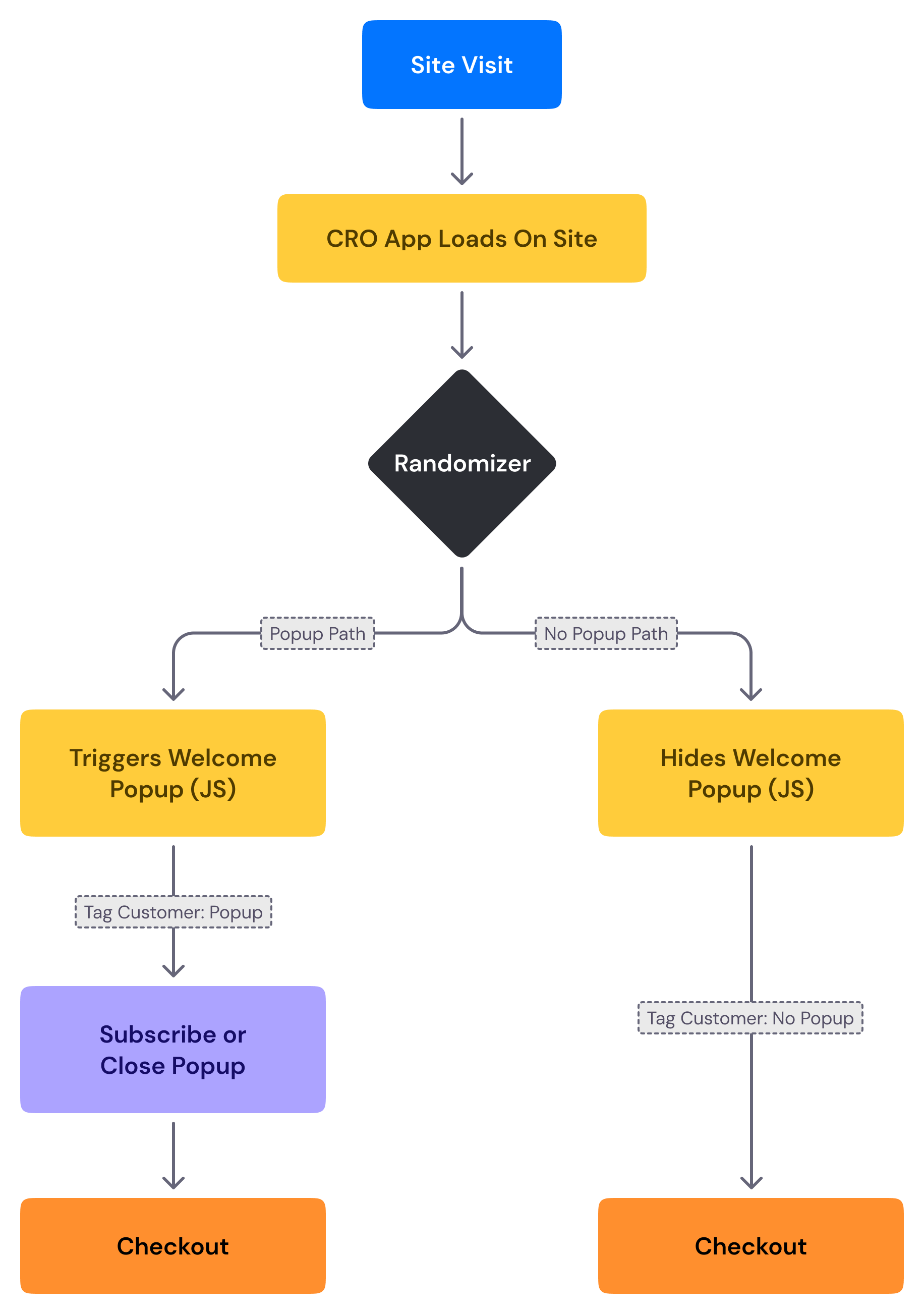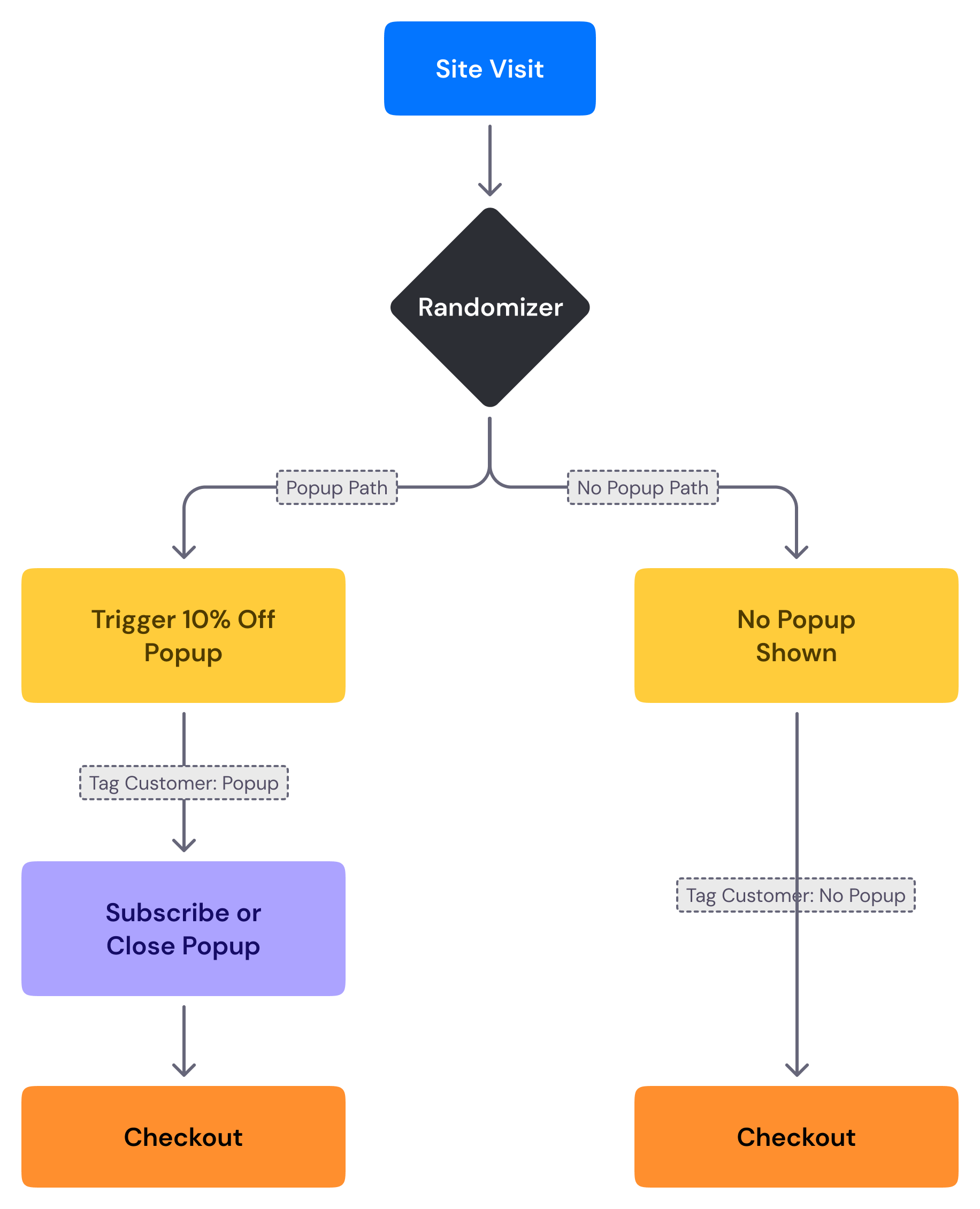 If you want to measure the actual revenue impact of your popups, you need to run a holdout test with a CRO mindset. You need to show the popup to Group A, tag every visitor that arrived in that group, and track visitors in another group, Group B, where people don’t see a popup. You still tag those people and follow the conversion rate, AOV, and revenue per visitor through their customer journey. Something like this: