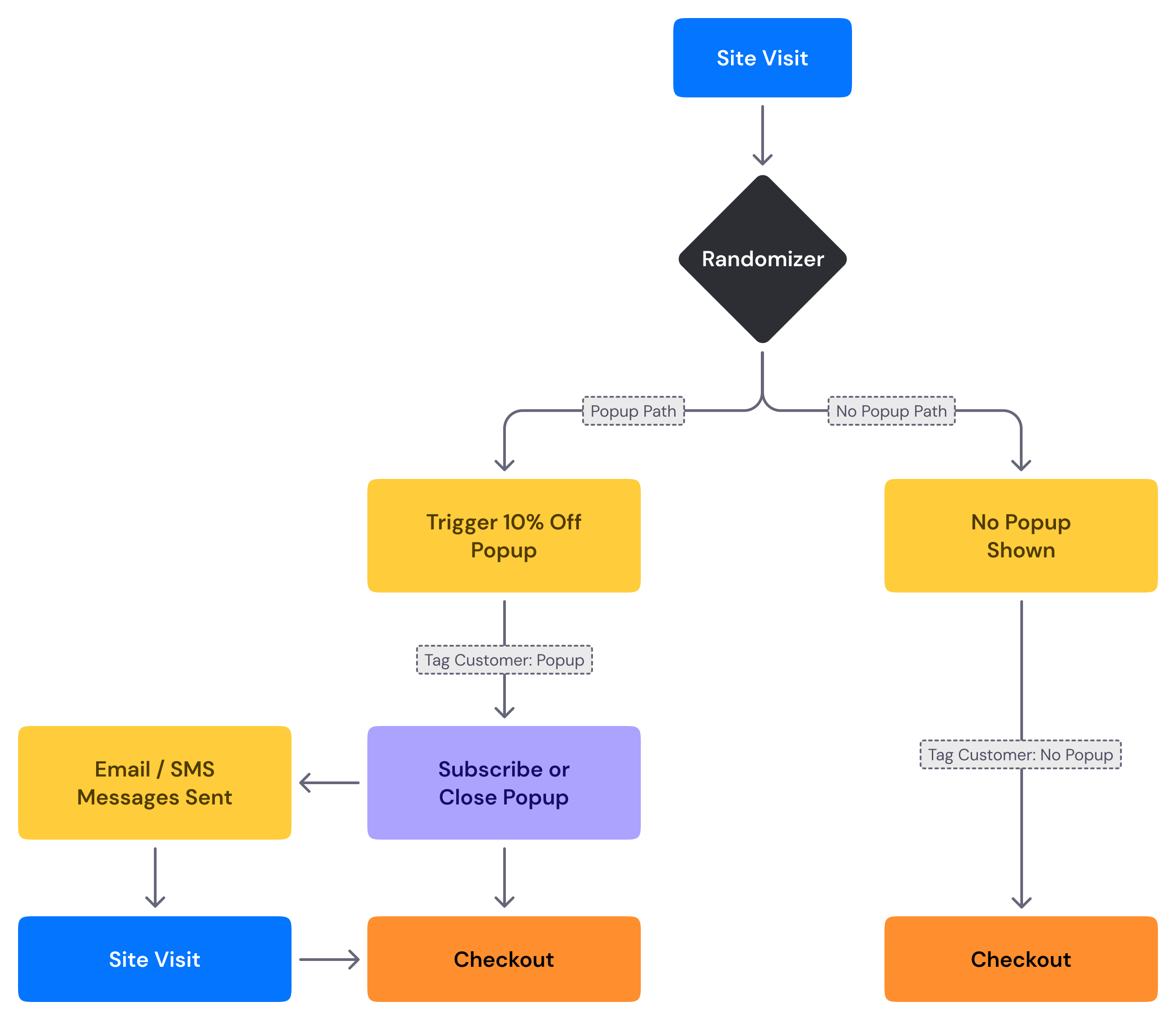 In reality, the popup group sends dozens of emails and text campaigns to direct customers back to your website. The flow looks more like this: