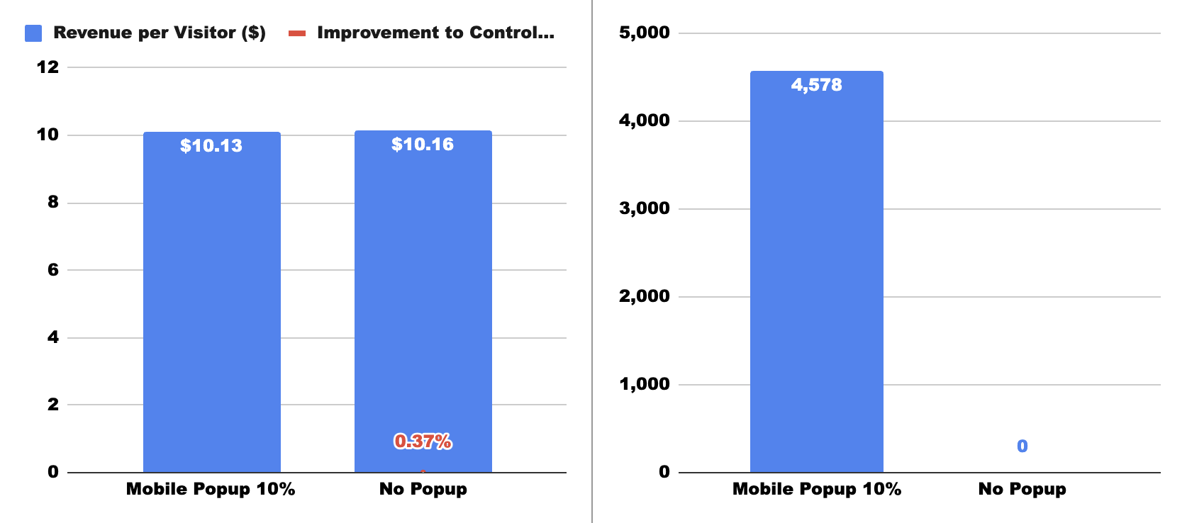 The results overview will look like this: It allows you to perfectly isolate the same-session revenue difference between showing a popup and not showing one.