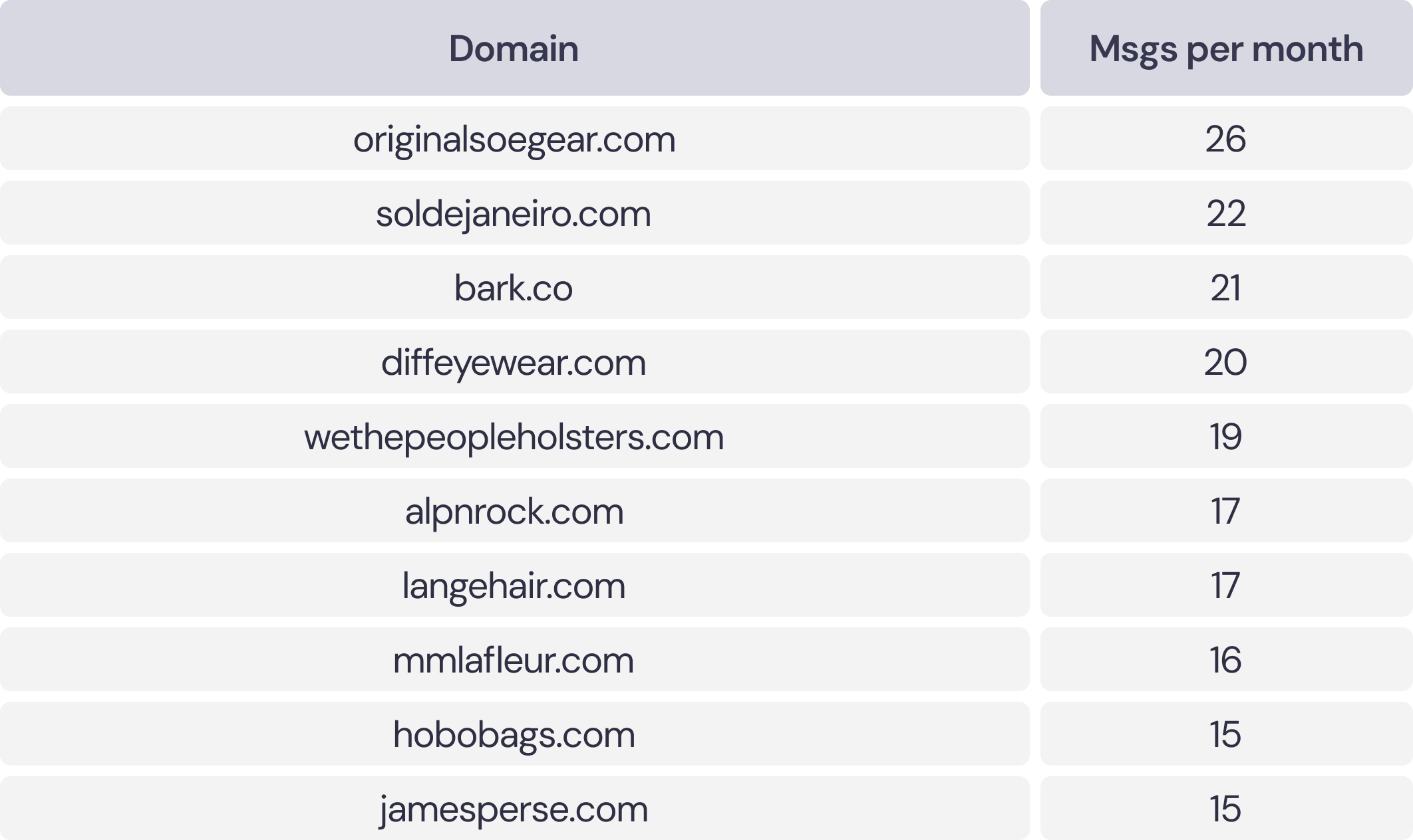 The most active brands in the dataset — including Original SOE Gear, Sol de Janeiro, Bark, Diff Eyewear, and We the People Holsters — send 10 or more messages per month, averaging 2–3 texts per week.