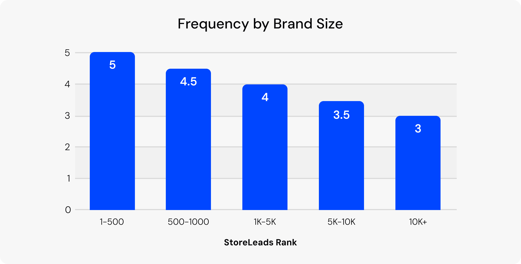 The biggest 500 stores send 5+ texts per month, keeping customers engaged with near-weekly touchpoints. Mid-tier brands (ranks 501–5,000) average 4-5 texts, maintaining a steady weekly rhythm. Smaller stores trail behind with just 3 sends, often saving SMS for big promos.