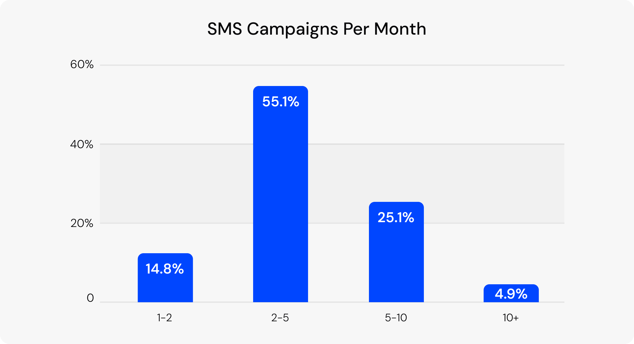 Over half of the analyzed brands fall into the 2–5 messages per month range, establishing a typical once-a-week cadence. Around a quarter of brands send 5–10 texts monthly, indicating more active campaign cycles. A smaller share, 14.8%, keep messaging minimal at 1–2 texts per month, while 4.9% of brands message most frequently, sending 10 or more messages each month.